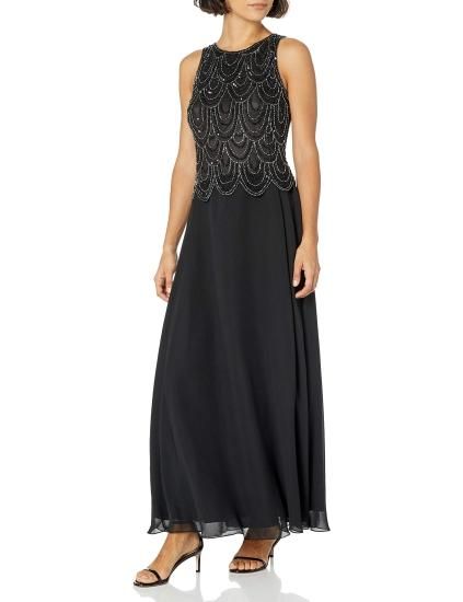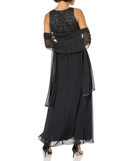 J Kara Women's Petite Sleeveless Beaded Pop Over Dress with Scarf Black 14P