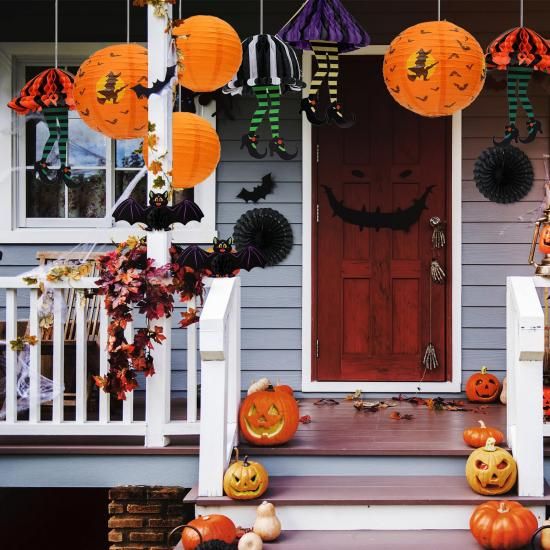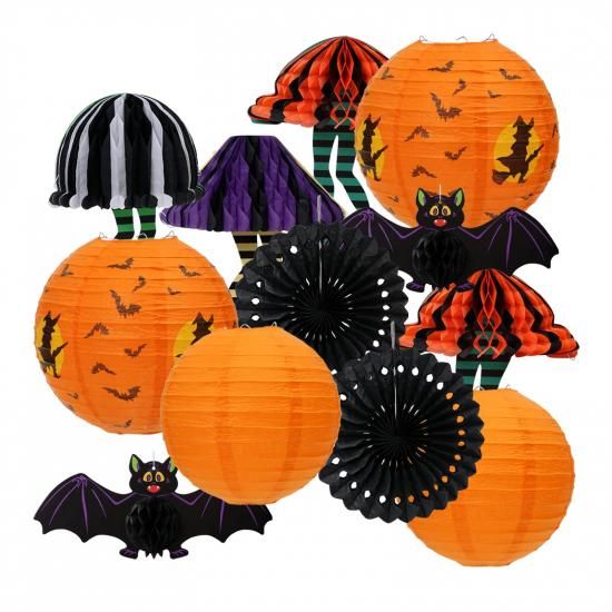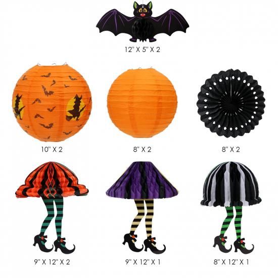 超お得な組み合わせ: 7 つのデザイン 12 種類の紙製ランタン ファン デコレーションのセット。12 インチのコウモリ 2 個、10 インチの魔女ランタン 2 個、8 インチのオレンジ色の紙製ランタン 2 個、8 インチの黒いファン 2 個、9 インチの魔女の下半身 4 個が含まれます。