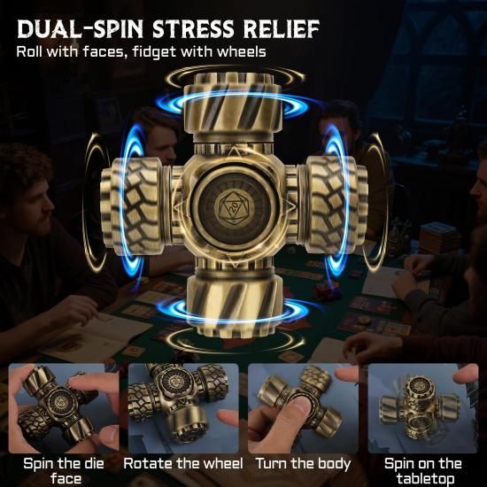 スピンを2倍にし、魔法を2倍に 顔と車輪が独立して動くファンタジー戦争の戦車のように車輪を回転させながら、サイコロをフリックして転がします。 デュアルアクションフィジェットは、激しい遭遇時に戦術的な集中力を促進します。